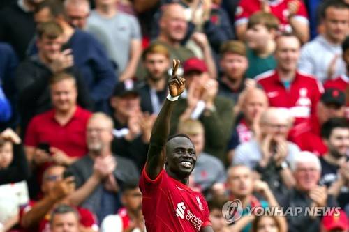 epa09475016 Sadio Mane of Liverpool celebrates after scoring the 1-0 lead during the English Premier League soccer match between Liverpool FC and Crystal Palace in Liverpool, Britain, 18 September 2021. EPA/Tim Keeton EDITORIAL USE ONLY. No use with unauthorized audio, video, data, fixture lists, club/league logos or 'live' services. Online in-match use limited to 120 images, no video emulation. No use in betting, games or single club/league/player publications