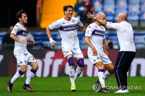 epa09475019 Fiorentina's Riccardo Saponara (2-R) celebrates with his coach Vincenzo Italiano (R) after scoring the 1-0 lead during the Italian Serie A soccer match between Genoa CFC and ACF Fiorentina at Luigi Ferraris stadium in Genoa, Italy, 18 September 2021. EPA/SIMONE ARVEDA