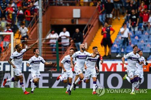 epa09475020 Fiorentina's Riccardo Saponara (C) celebrates with teammates after scoring the 1-0 lead during the Italian Serie A soccer match between Genoa CFC and ACF Fiorentina at Luigi Ferraris stadium in Genoa, Italy, 18 September 2021. EPA/SIMONE ARVEDA