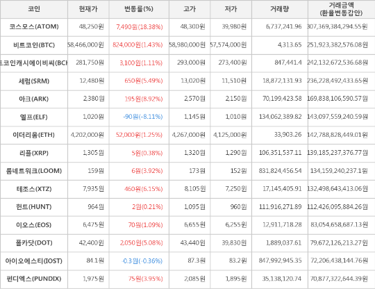 상승세를 보이는 가상화폐는 총 12종목으로 이 중 가장 큰 상승세를 보이는 코스모스는 전일 대비 18.38% 상승한 48,250원에 거래되고 있다.