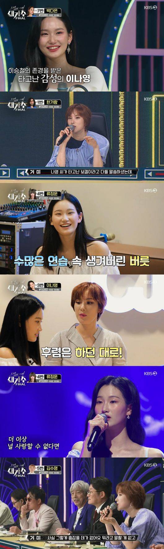 이나영은 899점으로 2위를 차지했다. 이나영은 "여기까지 올라올 줄 몰랐는데 스탭분들, 작가님들이 너무 잘 챙겨주셨다. 옆에서 믿어주신 가족들, 제 노래를 들어주신 심사위원 분들께 감사하다. 친구가 우승하니 더 기분 좋다. 앞으로 같이 좋은 음악하면서 멋진 아티스트가 되겠다"라고 말했다.