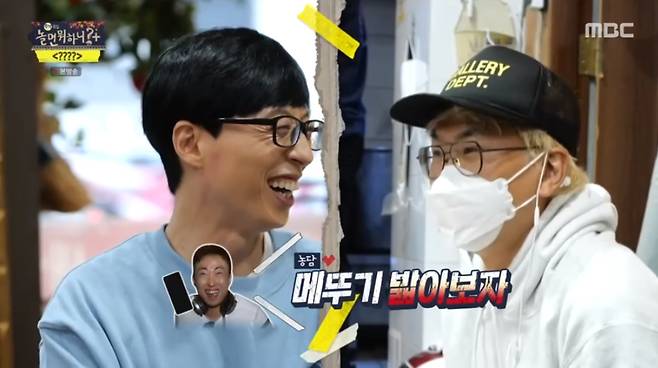 이를 듣고 있던 김태호 PD는 "(박)명수형이 전화가 왔다. 나랑 같이 하자고. '같이 메뚜기 밟아보자'고 하더라"고 했고 유재석은 "그 형은 왜 맨날 날 밟겠대"라고 덧붙여 웃음을 자아냈다. (사진=MBC '놀면 뭐하니' 캡처)