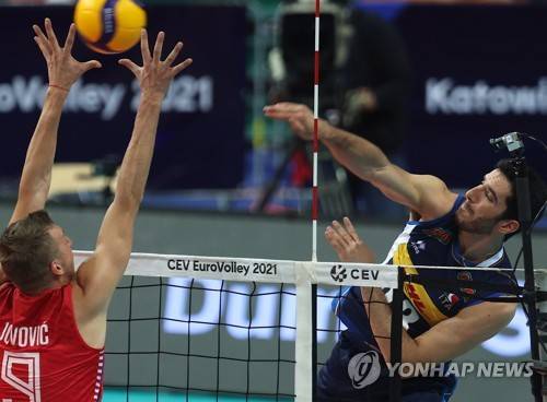 epa09475688 Giulio Pinali (R) of Italy in action against Serbia's Nikola Jovovic (L) during the 2021 Men's European Volleyball Championship semi final Match between Poland and Slovenia in Katowice, Poland 18 September 2021. EPA/ANDRZEJ GRYGIEL POLAND OUT