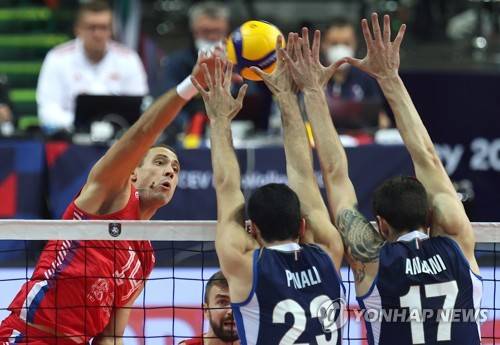 epa09475689 Giulio Pinali (C) and Simone Anzanii (R) of Italy in action against Serbia's Aleksandar Atanasijevic (L) during the 2021 Men's European Volleyball Championship semi final Match between Poland and Slovenia in Katowice, Poland 18 September 2021. EPA/ANDRZEJ GRYGIEL POLAND OUT