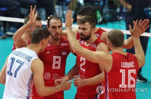 epa09475695 The Serbia team celebrate during the 2021 Men's European Volleyball Championship semi final Match between Poland and Slovenia in Katowice, Poland 18 September 2021. EPA/ANDRZEJ GRYGIEL POLAND OUT