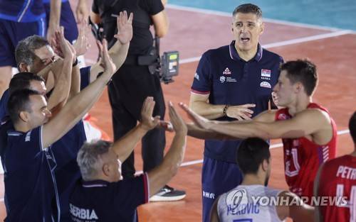 epa09475713 Head coach of Serbia Slobodan Kovac (C) reacts during the 2021 Men's European Volleyball Championship semi final match between Italy and Serbia in Katowice, Poland 18 September 2021. EPA/ANDRZEJ GRYGIEL POLAND OUT