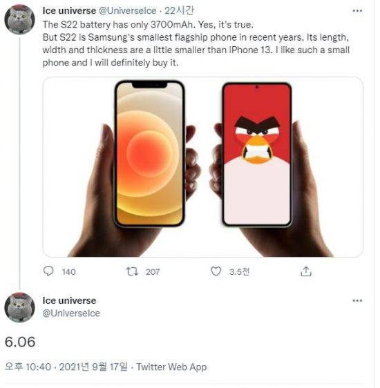 19일 관련 업계에 따르면 IT팁스터 아이스유니버스는 최근 자신의 트위터에 S22의 화면이 6.06인치라고 밝혔다. 그는 또 다른 트윗에서 S22가 최근 몇년을 통틀어 삼성전자의 가장 작은 플래그십폰이 될 것이라고 전했다.