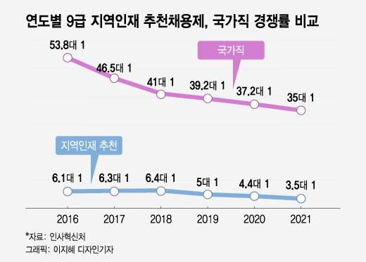 또 다른 논란의 지점은 형평성이다. 채용 전형은 달라도 동일한 9급으로 입사하는데 지역인재 추천의 필기시험 난이도는 평이한 수준이다. 국가직 9급이 필수·선택과목 등 5개 시험을 치러야 하는 데 반해 지역인채 추천은 국어, 한국사, 영어 3과목만 응시하면 된다. 해당 과목들도 지엽적인 문제가 많은 출제 의도를 파악하는 데 쉽지 않은 일반 9급에 비해 수월한 편이다.