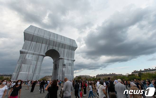 (파리=뉴스1) 이준성 프리랜서기자 = 건축물과 자연, 오브제 등을 거대한 천으로 포장하는 작업으로 거장 반열에 오른 대지 미술가 고(故) 크리스토 자바체프(Christo Javacheff)와 잔 클로드(Jeanne-Claude) 부부의 유작 ‘포장된 개선문 (L'Arc de Triomphe, Wrapped)’이 18일(현지시간) 대중들에게 공식 공개돼 작품을 감상하러 온 시민들로 파리 개선문과 샹젤리제 거리가 북적이고 있다.