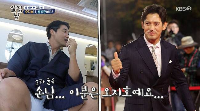 홍성흔은 "그럼 나랑 비슷한 사람으로 오지호 대 홍성흔 어떠냐"라고 물었다. 이에 김정임은 "당연한 걸 왜 묻냐. 내 이상형이 오지호였다"라고 말했다. 홍성흔은 "오지호가 내 친구다"라고 말했다. 김정임은 "자기는 잘생긴 친구는 안 보여주더라"라고 말해 웃음을 자아냈다.