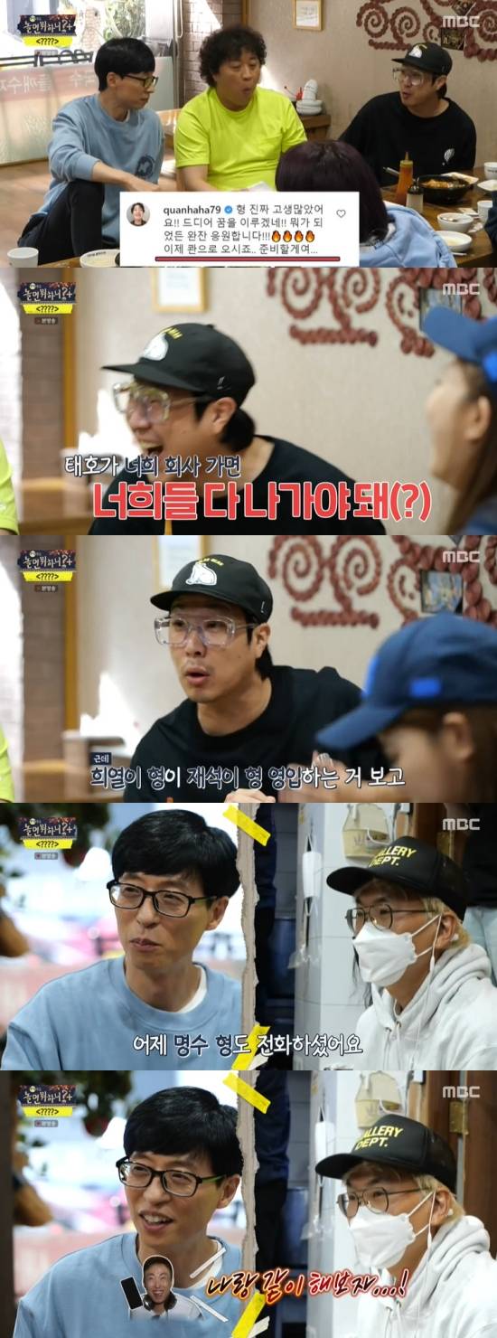 더 나아가 정준하는 "태호는 그만둔 거냐"라며 김태호 PD의 퇴사를 언급했다. 하하는 "태호 형 어제 내가 SNS에 글 남겼다. 우리 회사 준비하고 있다고"라며 기대했고, 유재석은 "태호가 너네 회사 들어가면 너네들 다 나가야 된다. 콴 엔터가 아니라 호 엔터로 바꿔야 한다"라며 만류했다.