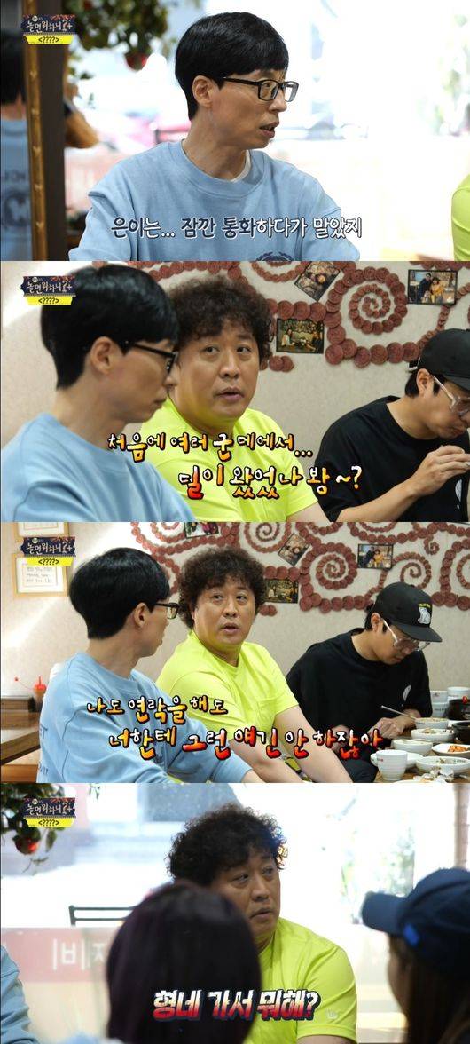 하하는 “송은이에게는 전화가 오지 않았느냐”고 물었다. 유재석은 “송은이는 잠깐 통화하다 말았다”고 말했고, 이에 정준하는 “처음에 여러 곳에서 딜이 왔었나봐? 너 시장에 나오면 막 그러나봐. 그렇지?”라고 소속사 이적에 대해 조심스럽게 말을 열었다.