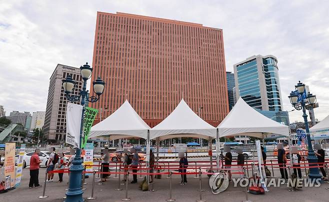 (서울=연합뉴스) 홍해인 기자 = 19일 오전 서울역 중구 신종 코로나바이러스 감염증(코로나19) 임시선별검사소를 찾은 시민들이 검사 순서를 기다리고 있다.