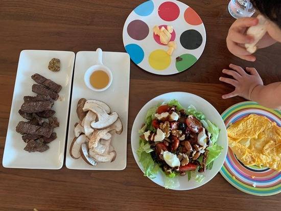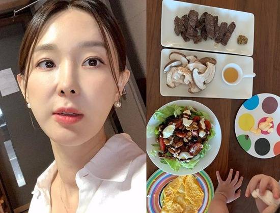 이날 공개된 사진에는 소고기, 버섯, 샐러드, 계란으로 건강하게 차려진 아침상이 담겼다.