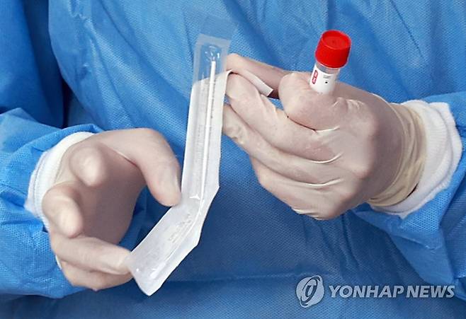 (서울=연합뉴스) 홍해인 기자 = 19일 오전 서울역 중구 신종 코로나바이러스 감염증(코로나19) 임시선별검사소에서 검사소 관계자가 검사 키트를 나눠주고 있다.