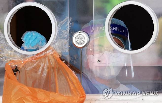 (서울=연합뉴스) 홍해인 기자 = 19일 오전 서울역 중구 신종 코로나바이러스 감염증(코로나19) 임시선별검사소에서 의료진이 검사 시작을 기다리고 있다.