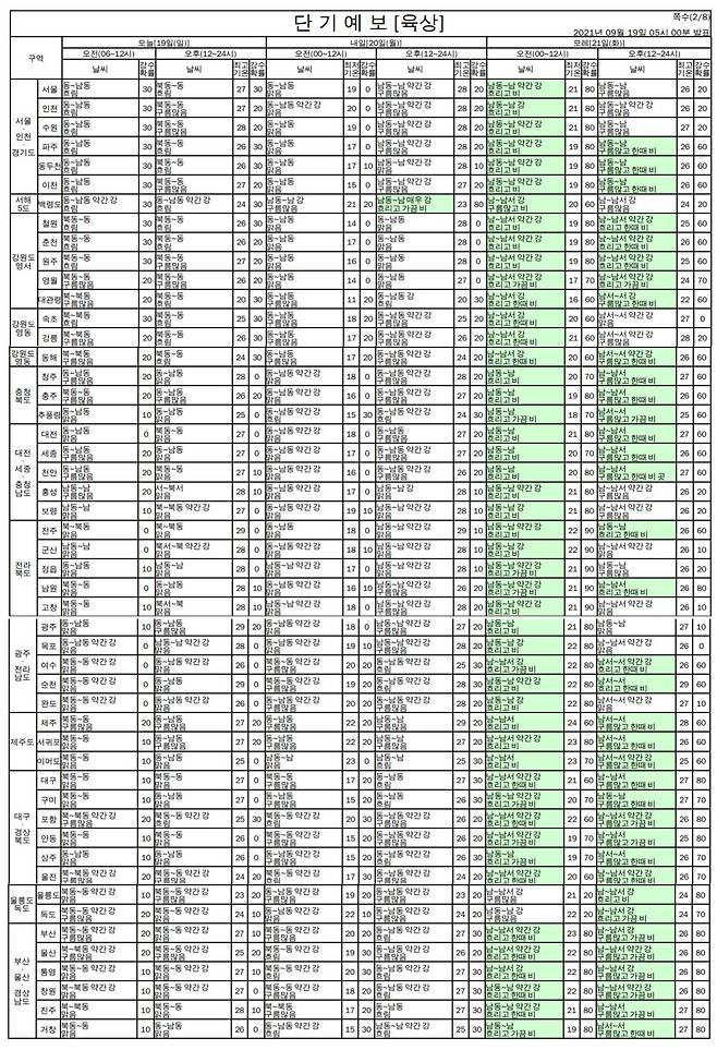 기상청은 19일 "추석인 21일 서쪽에서 다가오는 기압골의 영향으로 새벽에 수도권과 강원 영서, 충청, 호남, 제주에서 시작된 비가 아침에는 나머지 지역으로 확대되겠다. 비는 오후에 수도권과 충남, 호남부터 차차 비가 그치기 시작해 저녁에는 대부분 지역에서 비가 개겠다"고 밝혔다.