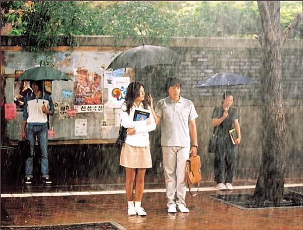 <늑대의 유혹>에서 강동원이 이청아의 우산 속으로 들어가는 장면은 여성 관객들의 마음 속을 흔든 최고의 장면 중 하나로 꼽힌다. 하지만 남성관객들도 슬퍼하거나 노여워할 필요는 없다. <번지점프를 하다>에서 서인우(이병헌 분)의 우산 속으로 들어가는 인태희(이은주 분)가 있기 때문이다. 영화가 시작되자마자 남성관객들을 무장해제시켰던 <번지점프를 하다>의 설레는 오프닝 장면이다.