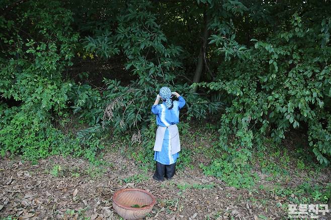 사진으로 좋은 인연이 되어주신 남혜인 명인님께서 쪽빛 옷을 입고 밤나무 아래에서 일하시는 모습도 참 곱습니다.