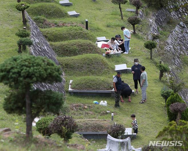 [강릉=뉴시스] 김경목 기자 = 추석을 이틀 앞둔 19일 오후 성묘객들이 강원도 강릉시 영동공원묘원에서 성묘를 하고 있다. 2021.09.19. photo31@newsis.com
