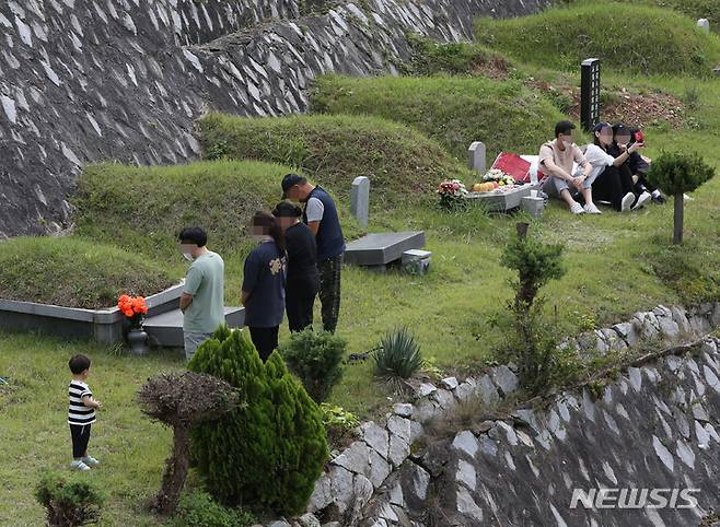 [강릉=뉴시스] 김경목 기자 = 추석을 이틀 앞둔 19일 오후 성묘객들이 강원도 강릉시 영동공원묘원에서 성묘를 하고 있다. 2021.09.19. photo31@newsis.com