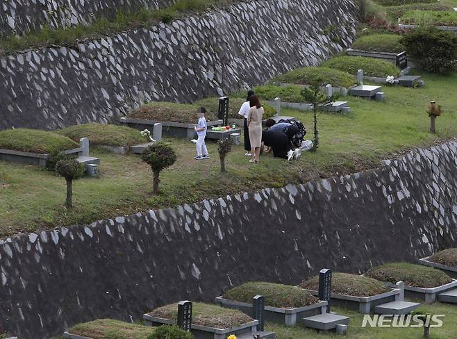 [강릉=뉴시스] 김경목 기자 = 추석을 이틀 앞둔 19일 오후 성묘객들이 강원도 강릉시 영동공원묘원에서 성묘를 하고 있다. 2021.09.19. photo31@newsis.com