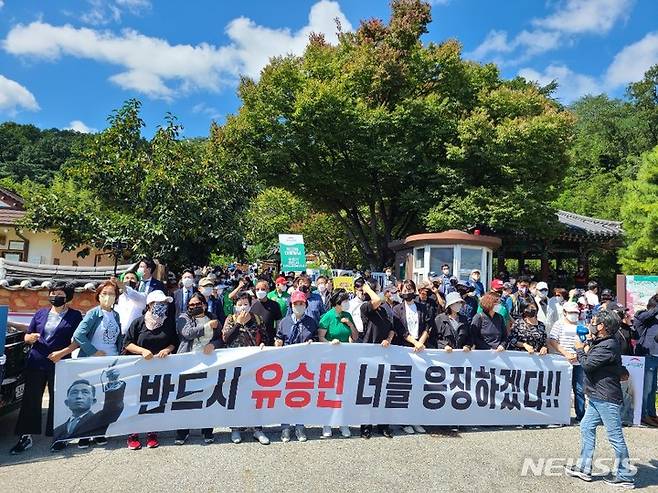 [구미=뉴시스] 박홍식 기자 = 우리공화당 당원과 박근혜 전 대통령 지지자들이 19일 경북 구미 박정희 전 대통령 생가 입구에서 국민의힘 대선주자인 유승민 전 의원 방문에 앞서 집회를 열고 있다. 이들은 "배신자가 왜 왔냐"며 유 전 의원을 강하게 비난했다. 2021.09.19 phs6431@newsis.com