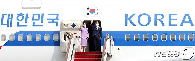(서울=뉴스1) 박정호 기자 = 제76차 유엔총회 참석을 위해 미국으로 출국하는 문재인 대통령과 부인 김정숙 여사가 19일 오후 경기 성남시 서울공항에서 공군 1호기에 올라 환송객들에게 손인사를 하고 있다. 2021.9.19/뉴스1