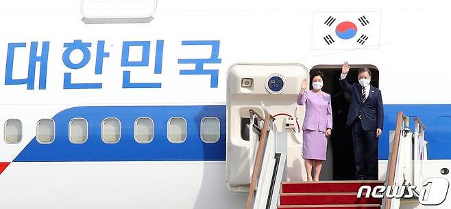 (서울=뉴스1) 박정호 기자 = 제76차 유엔총회 참석을 위해 미국으로 출국하는 문재인 대통령과 부인 김정숙 여사가 19일 오후 경기 성남시 서울공항에서 공군 1호기에 올라 환송객들에게 손인사를 하고 있다. 2021.9.19/뉴스1