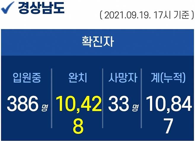 19일 오후 5시 기준, 경남 도내 입원 중인 확진자는 386명이고, 퇴원 1만 428명, 사망 33명, 누적 확진자는 총 1만 847명이다.