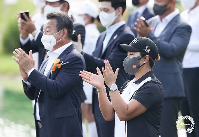 (서울=연합뉴스) 박세리가 19일 충북 청주시 세종 실크리버 컨트리클럽에서 열린 한국여자프로골프(KLPGA) 투어 OK저축은행 박세리 인비테이셔널 대회 3라운드 18번홀에서 경기를 지켜보며 박수를 치고 있다. 2021.9.19 [KLPGA 제공. 재판매 및 DB 금지]