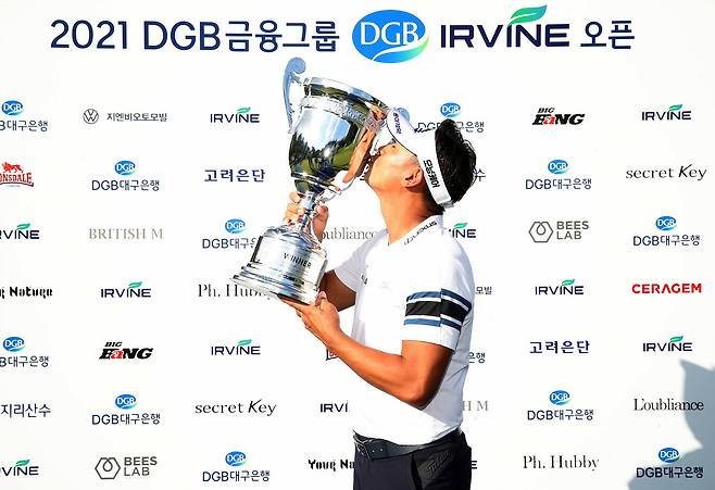 (서울=뉴스1) = 19일 경상북도 칠곡 파미힐스CC에서 열린 2021 시즌 KPGA 코리안투어 ‘2021 DGB금융그룹 어바인 오픈' 우승을 차지한 박상현이 우승 트로피에 키스를 하고 있다. (KPGA제공) 2021.9.19/뉴스1