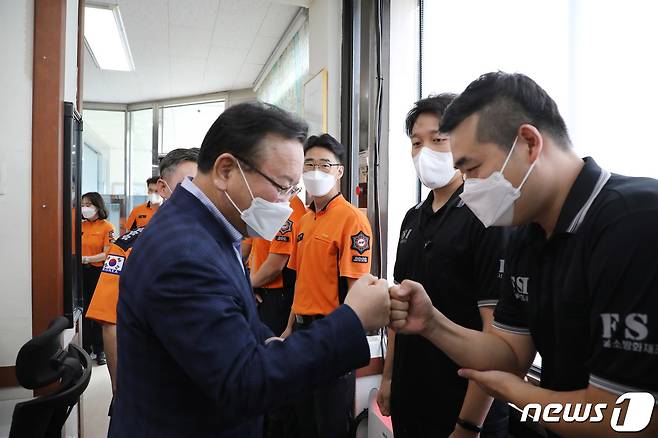 (서울=뉴스1) = 김부겸 국무총리가 추석 연휴 둘째 날인 19일 오후 추석 비상근무기관 방문의 일환으로 서울 동대문소방서를 찾아 출동대원들을 격려하고 있다. (동대문소방서 제공) 2021.9.19/뉴스1