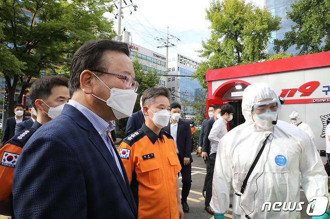 (서울=뉴스1) = 김부겸 국무총리가 추석 연휴 둘째 날인 19일 오후 추석 비상근무기관 방문의 일환으로 서울 동대문소방서를 찾아 음압구급차 시연을 지켜보고 있다. (동대문소방서 제공) 2021.9.19/뉴스1