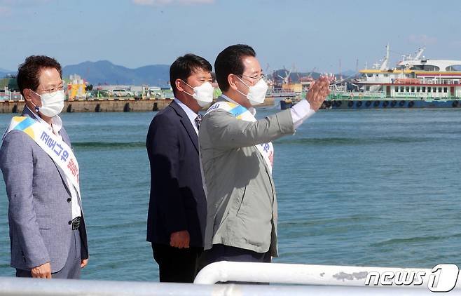 (목포=뉴스1) 전원 기자 = 김영록 전라남도지사가 추석 명절을 맞아 19일 오후 목포여객선터미널에서 신안 홍도 등 섬에 있는 고향 집을 찾아가는 귀성객들에게 손들어 인사를 하고 있다.(전남도 제공) 2021.9.19/뉴스1