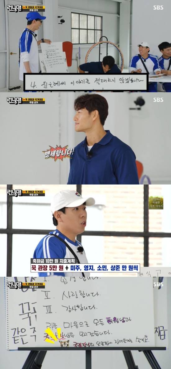 김종국은 "재미가 있어야 하고 운동에 진심이고 충성심이 있어야 한다"라며 심사 기준을 공개했고, 멤버들은 각자 종이에 공약을 적었다.