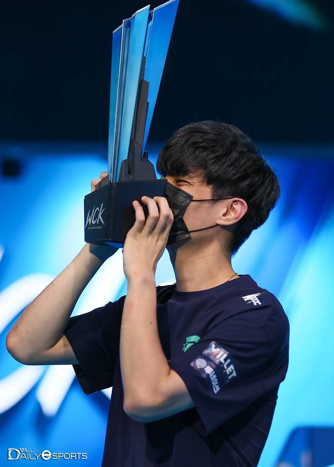 2021 와일드 리프트 챔피언스 코리아(이하 WCK) 초대 챔피언에 등극한 롤스터Y '살렘' 이성진이 우승 트로피에 키스를 했다.