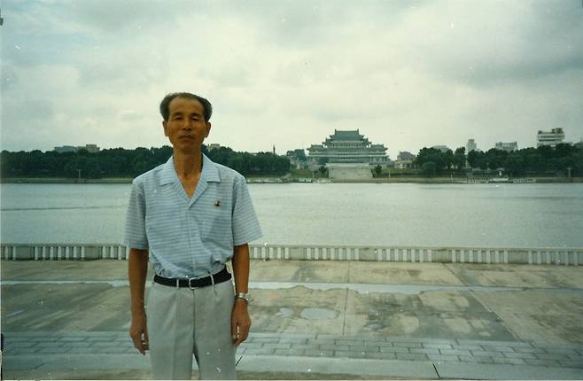 | ▲ 김수경과 인민대학습당 김수경 뒤편, 대동강 건너 보이는 건물이 인민대학습당이다. 주체사상탑 근처에서 촬영한 사진으로 보인다. 김수경은 북한의 국가도서관에서 30년이나 일했다. 천재이자 석학이었던 그는 북한 도서관에 어떤 발자취를 남겼을까. |