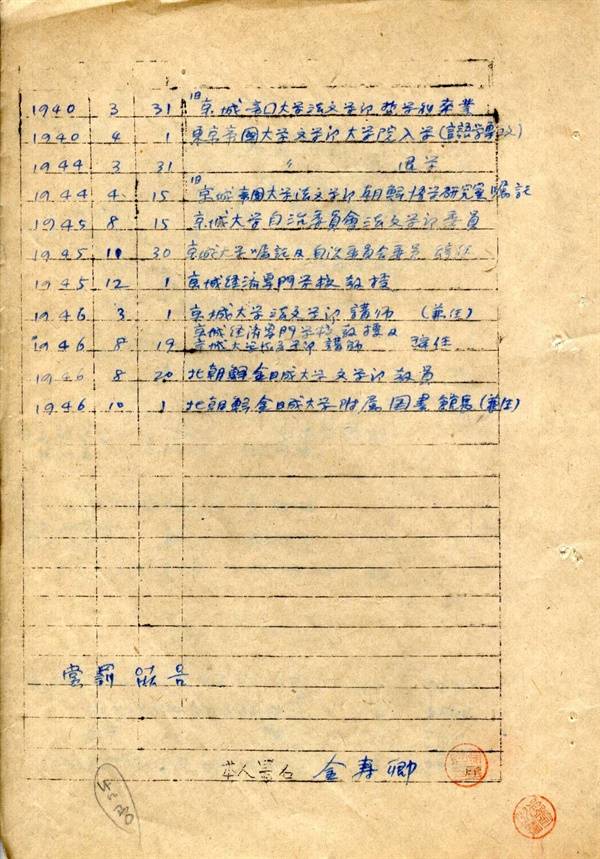 | ▲ 김수경 자필 이력서 1946년 12월 28일 김수경이 김일성대학에 제출한 자필 이력서다. 두 페이지로 작성한 김수경의 이력서 중 뒷면이다. 김수경은 '김일성대학 문학부 교원(교수)과 부속도서관장을 겸임'한다는 내용을 최근 경력으로 써넣었다. |