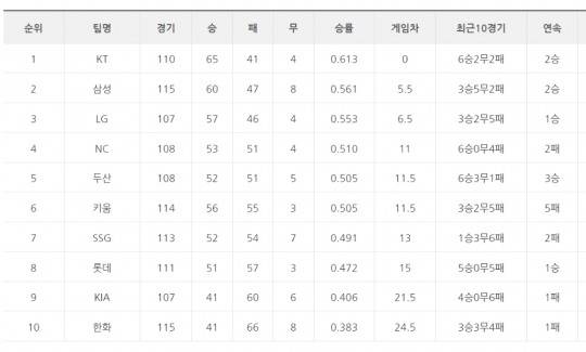 [프로야구 19일 팀 순위]두산, 3연승으로 5연패 키움 제치고 단독 5위로..NC는 6연승 뒤 선두 kt에 연패 당해..LG, KIA에 전날 패배 설욕하며 3연패 탈출