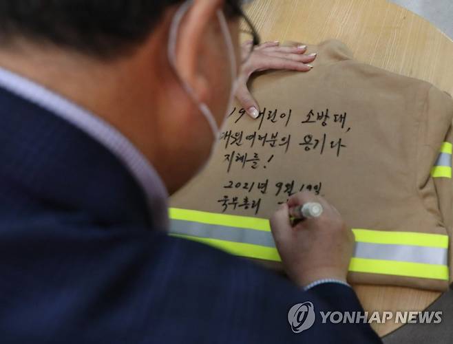 (서울=연합뉴스) 김부겸 국무총리가 추석 연휴인 19일 오후 동대문소방서를 방문해 방화복에 메시지를 적고 있다. 2021.9.19 [동대문소방서 제공. 재판매 및 DB금지]