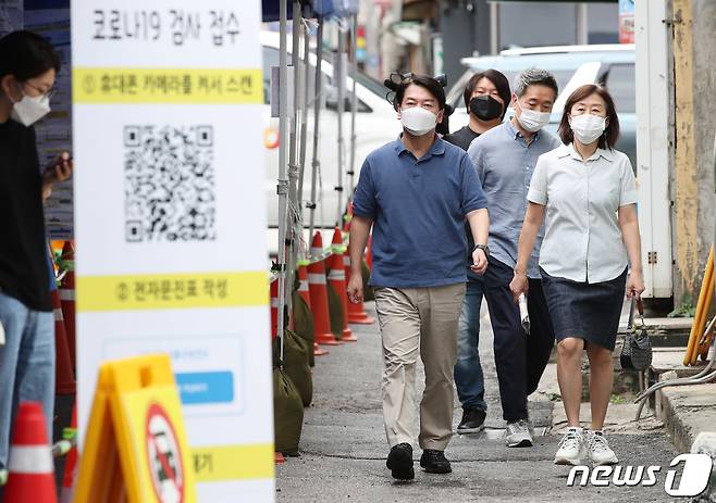 (서울=뉴스1) 박정호 기자 = 안철수 국민의당 대표와 부인 김미경 교수가 19일 오전 서울 중구보건소 신종 코로나바이러스 감염증(코로나19) 선별진료소로 의료자원봉사를 위해 걸어오고 있다. 2021.9.19/뉴스1