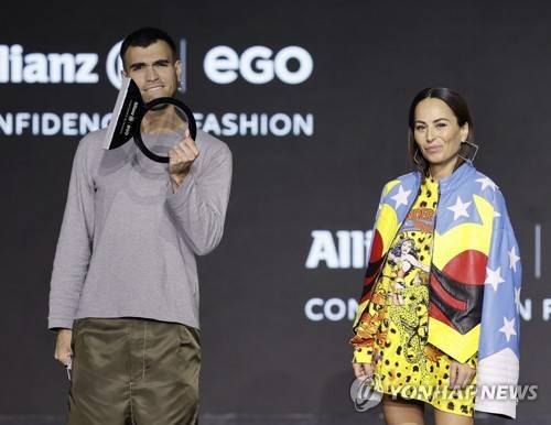 epa09476223 Spanish designer Ruberarth poses with his Allianz Ego Confidence in fashion award next to Spanish designer Maria Escote during the Mercedes-Benz Fashion Week (MBFWM) in Madrid, Spain, 19 September 2021. Spring-Summer 2022 collections are presented at the MBFWMadrid from 16 to 19 September 2021. EPA/Ballesteros