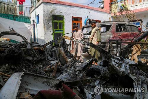 epa09476246 Family members of the victims of a US drone strike, stand beside the wreckage of the damaged vehicles, at their home, a day after US apologised for mistakenly attacking the civilians, in Kabul, Afghanistan, 19 September 2021. A US drone strike at a civilian compound on 29 August killed at least 10 persons including seven children in Kabul. EPA/STRINGER