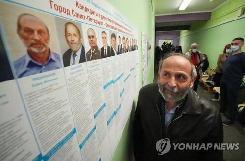 of the Yabloko party who is running for both the State Duma and the regional legislature looks at a candidates list at a polling station in St. Petersburg, Russia, Sunday, Sept. 19, 2021. Vishnevsky discovered that there are two other men running in both races under the same name as him. One of his opponents is from the ruling United Russia party, according to the newspaper Novaya Gazeta. (AP Photo/Dmitri Lovetsky)