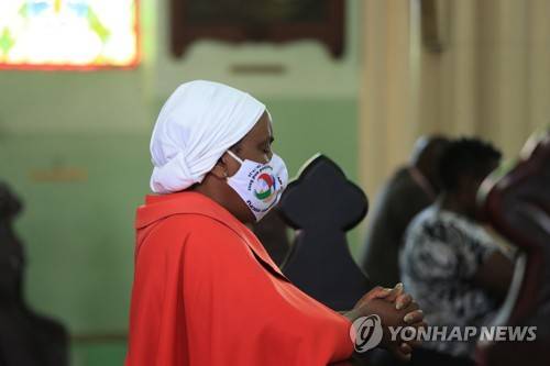 epa09476260 A woman attends a church service at the Cathedral of the Sacred Heart in Harare, Zimbabwe, 19 September 2021. The country's parliament on 14 September 2021 enforced a ban from attending church services to those who have not yet received a COVID-19 vaccine. EPA/AARON UFUMELI
