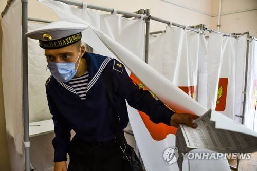 A Russian military sailor leaves a voting booth at a polling station during the Parliamentary elections in Sevastopol, Crimea, Sunday, Sept. 19, 2021. The head of Russia's Communist Party, the country's second-largest political party, is alleging widespread violations in the election for a new national parliament in which his party is widely expected to gain seats. (AP Photo)
