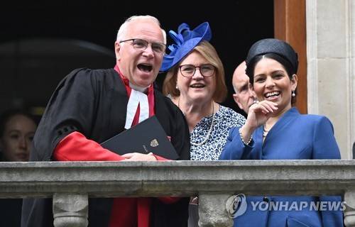 epa09476265 Britain's Home Secretary Priti Patel (R) reacts after attending a service of Thanksgiving and Rededication to commemorate the 81st Anniversary of the Battle of Britain, at Church House in London, Britain, 19 September 2021. EPA/FACUNDO ARRIZABALAGA