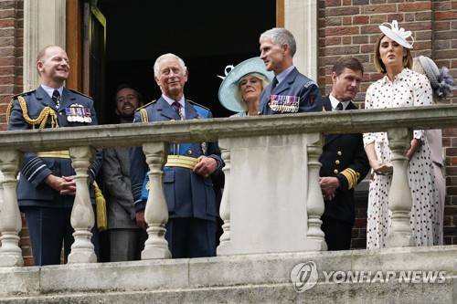 Britain's Prince Charles, centre left, Camilla, the Duchess of Cornwall, centre right, watch a fly past of historic aircrafts, from the balcony of Church House after a service to mark the 81st Anniversary of the Battle of Britain at Westminster Abbey in London Sunday Sept. 19, 2021. (AP Photo/Alberto Pezzali)