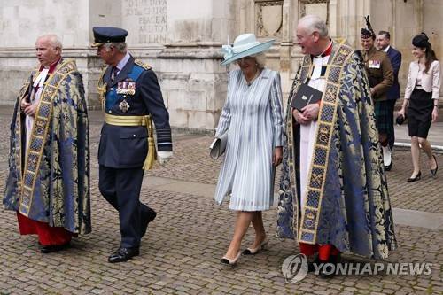 Britain's Prince Charles, second left and Camilla, the Duchess of Cornwall depart after attending a service to mark the 81st Anniversary of the Battle of Britain at Westminster Abbey in London Sunday Sept. 19, 2021. (AP Photo/Alberto Pezzali)